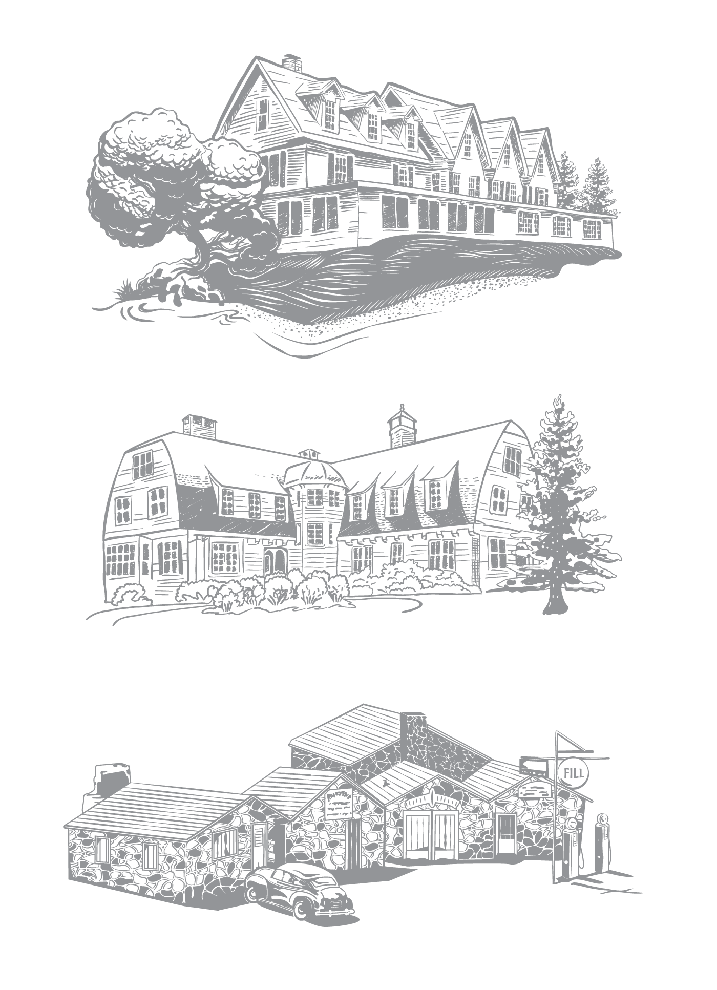 2017-2018 [Vector Art]. Art designed for custom letterpress event invitations top 2 images for wedding invitations, bottom for unknown event. Final product pressed in silver or gold on off white paper.